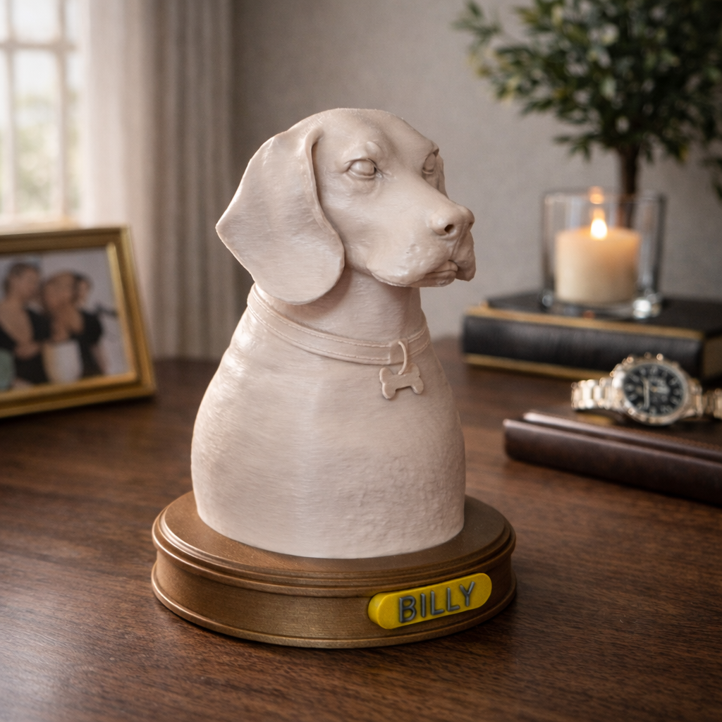 Criamos bustos personalizados em impressão 3D com traços realistas e acabamento artístico, perfeitos para homenagear seu melhor amigo.