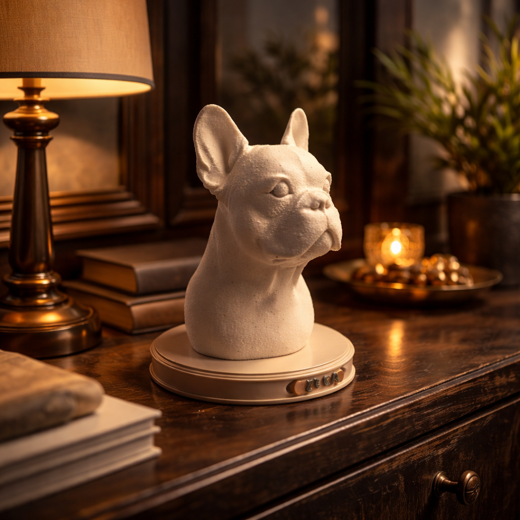 Criamos bustos personalizados em impressão 3D com traços realistas e acabamento artístico, perfeitos para homenagear seu melhor amigo.