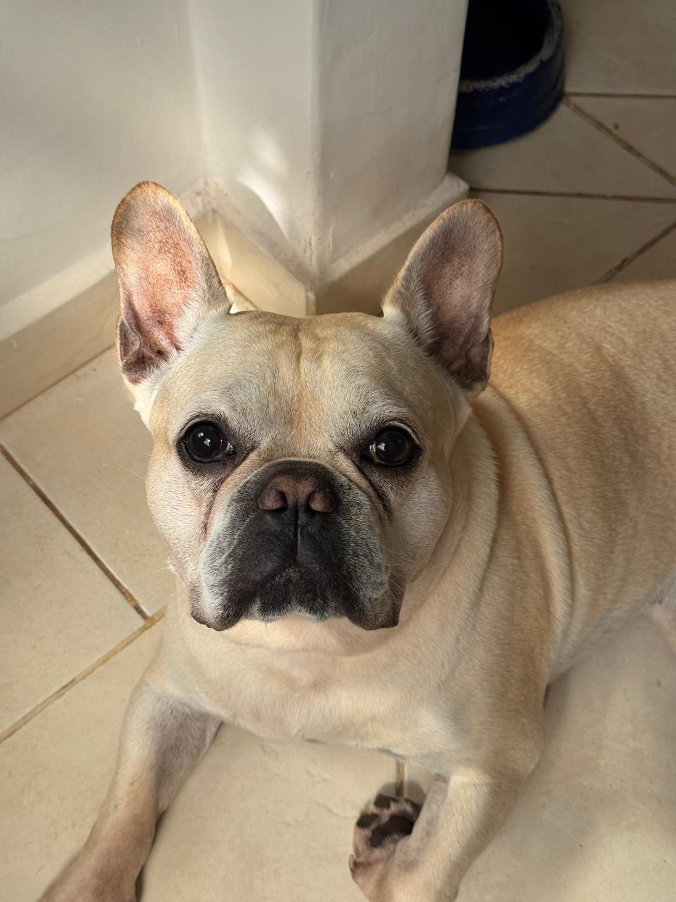 Pet relaxado e atento, orelhas visíveis e evitar coleiras que escondam detalhes.